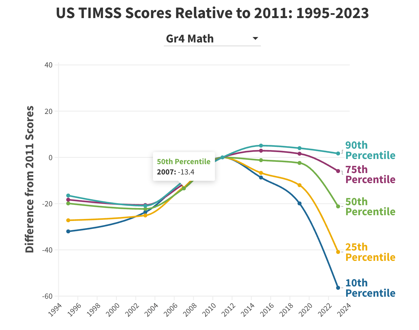 International benchmarks tell a similar—and in some ways more alarming—story. The Trends in International Mathematics and Science Study (TIMSS) shows U.S. Grade 4 math performance improving modestly through 2011, then diverging sharply. Since then, top-performing students have held steady while scores for lower-performing students have plummeted—especially after 2019.